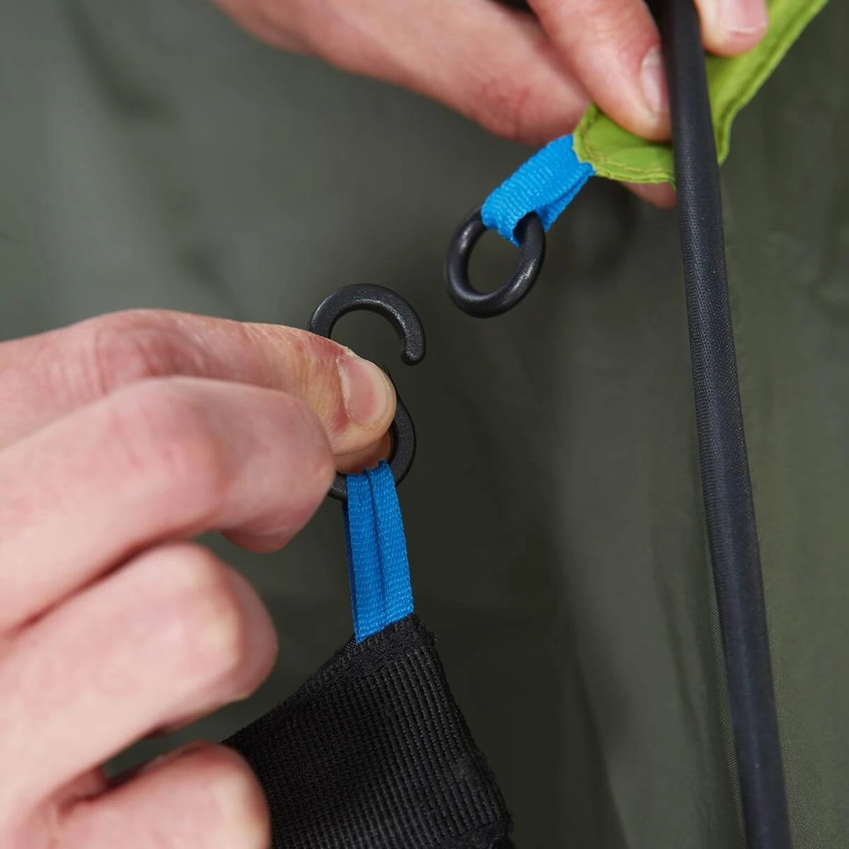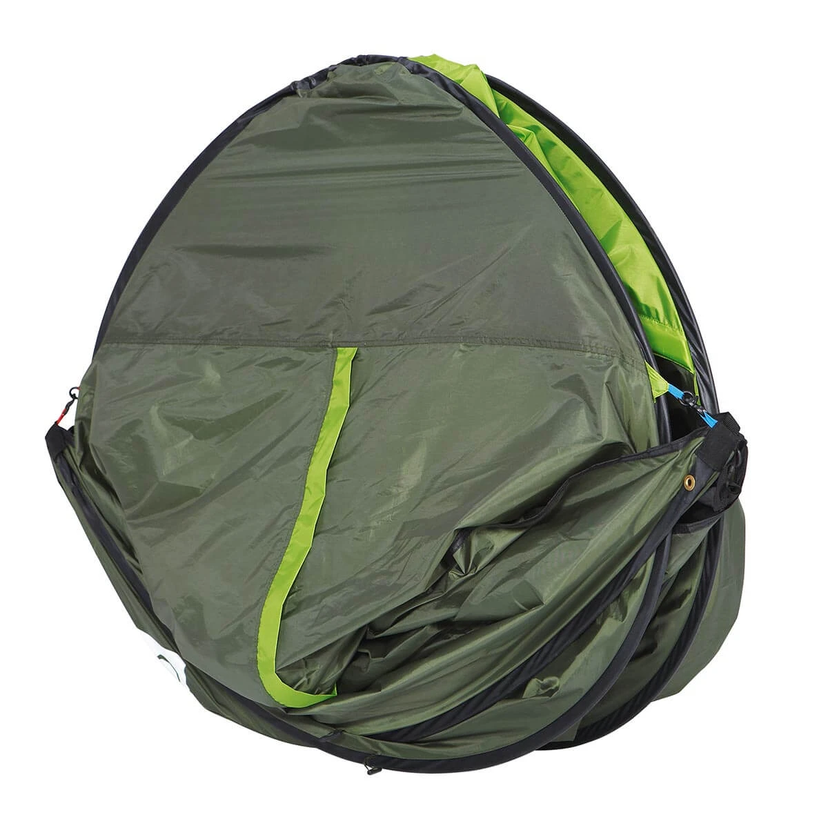 Cette tente est équipée d’une structure autoportante et d’un système de repliage guidé avec des repères de couleurs. Sur la tente, 4 crochets et 4 anneaux de mêmes couleurs que les crochets sont disposés. Il suffit d’assembler chaque crochet à son anneau pour la déplier et la plier. Un jeu d’enfant !