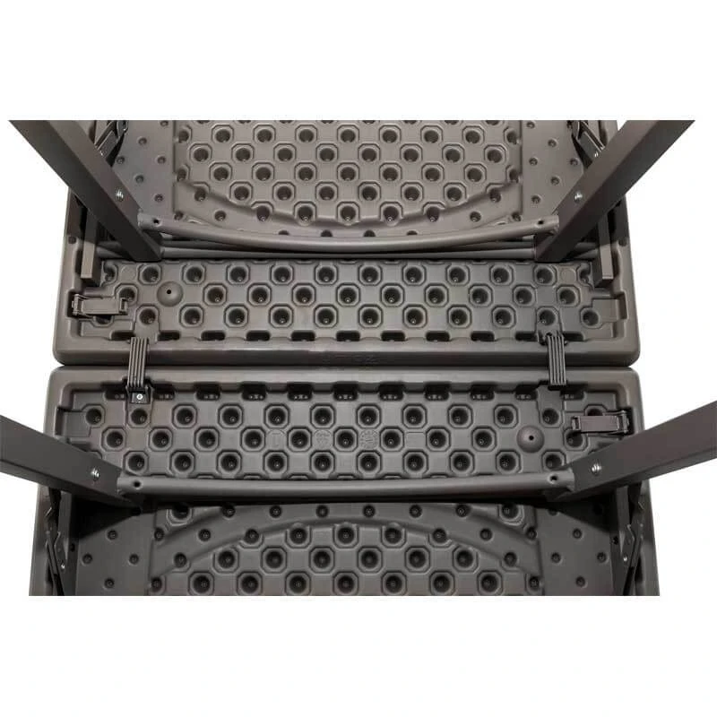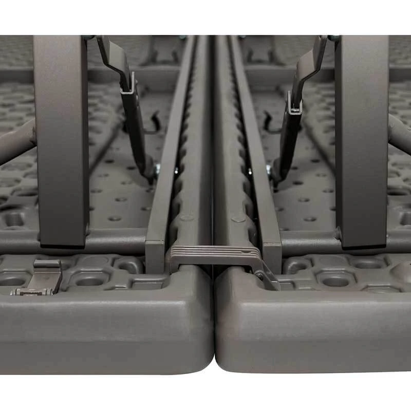 Cette table pliante résiste à une charge maxi record de 180kg. Son plateau épais résiste aux impacts ainsi qu’à l’humidité et aux UV.