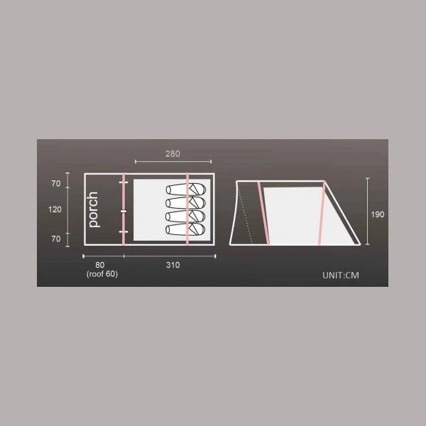 L’Abysse comporte une chambre unique assez grande pour pouvoir accueillir 4 personnes. Elle est idéale pour les courts séjours ! Il est possible de ne pas monter la chambre afin de se servir de la tente comme un abri confortable. En effet, sa hauteur de 1,9m permet une circulation sans avoir à se baisser à l’intérieur de la tente. Sa surface de 10m² en fait un abri tout à fait convenable !